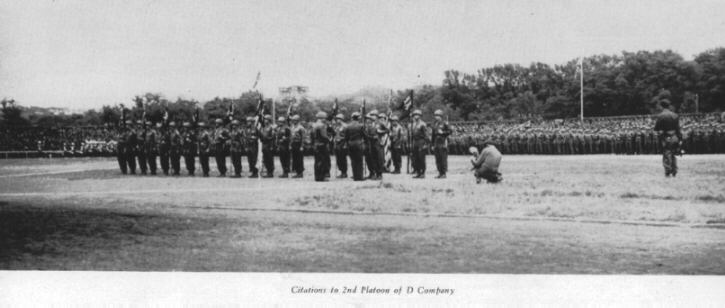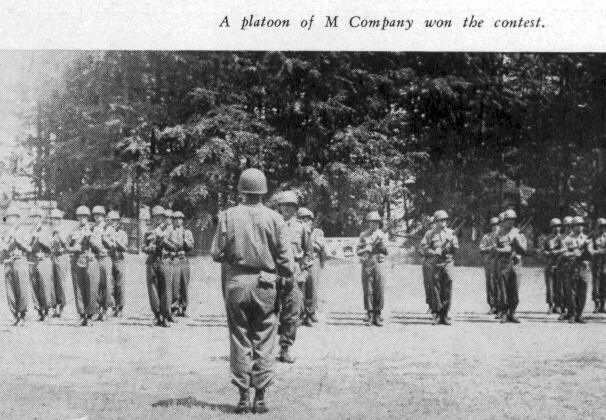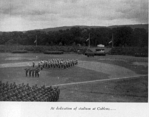 There was a broad program of recreation and athletics and special schools and ceremonies. There were movies and USO Shows. In a Regimental Platoon Drill contest held 30 June, at Kottenheim, a platoon of M Company won top honors, while a platoon of I Company was a very close second. On 1 July, the Regiment participated in dedication ceremonies of the Santa Fe Stadium in Coblenz where Presidential Unit Citations were presented to the 1st Battalion, to Company C, and to the 2nd Platoon of Company D by General Gerow, the army commander (click here to read the Unit Citations). In the baseball game which followed, the 35th Divisions team, coached by Lt. Warren Hodges of I Company, defeated the 106th Division 5 to 3. The 134th Infantry on 5 July dedicated its own baseball park near Niedermendig, Romanowski Field, in honor of Pfc. Chester J. Romanowski of Detroit, first soldier of the 134th to die in France (9 July, 1944), and for two years a star on the Regiments division championship baseball team. In the baseball game, Manager E. C. Reischels 134th team beat the Division Special Troops 12 to 3.