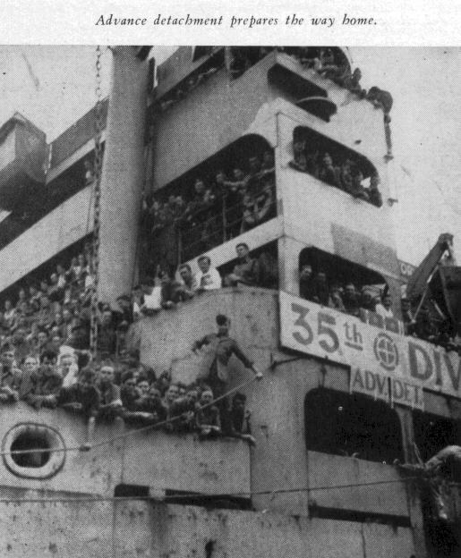 Soon it became clear that the 35th Division was earmarked for service in the war against Japan. The readjustment program brought a widespread change in personnel, but with a core of the old volunteers yet remaining, the Regiment (after relief by the 5th French Infantry Regiment) moved - again by rail and motor - 11-13 July, back into France. Exactly a year after it had moved up to the lines at St. Lo - on the eve of Bastille Day, the Regiment closed into the tent city of Camp Norfolk - about 18 miles south of Chalons - in the Reims Assembly Area Command to prepare for return to the United States. Just before the Regiment left Camp Norfolk, and just in time to make the homeward voyage hold a completely joyful attraction, news came of the surrender of Japan.
