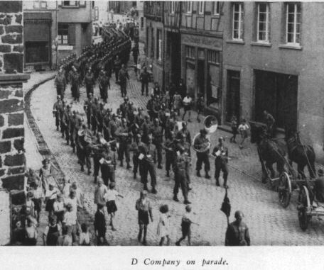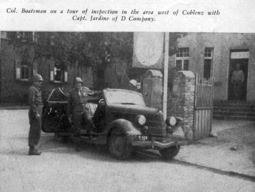 After an intermediate stop with XVI Corp in the vicinity of Bechum (18 - 26 May), and G Company had a special assignment at Bielefeld as security detail for the staging area of the Berlin District Headquarters, and K a mission at Eselheide at a PW camp, the Regiment undertook a longer move (185 miles) to the southwest. This time troops other than those with the organic transportation went by rail - in box cars of the noted "40 and 8" caliber. Proceeding on a circuitous route through the Ruhr area, Roermond, Maastricht, Aachen, Duren, and Bonn, the long, slow trains arrived at Niedermendig (20 miles west of Coblenz) at 0500 on 29 May. Attached to the 66th Division, XXIII Corps, Fifteenth Army, the Regiment had a mission to occupy, organize, secure, and govern Landkreis (county) Mayen and Landkreis Ahrweiller and to patrol the west bank of the Rhine in the sector to prevent the crossing of unauthorized persons. The Regimental C.P. was established at Bassenheim, the 1st Battalion at Niedermendig, the 2nd at Adenau, the 3rd, Kottenheim, Service Company, Kruft. (The former regimental commander - now assistant division commander - was in the same area where he had been 26 years earlier as a first sergeant with the 4th Division on occupation duty; he returned to the scene of his old headquarters, and visited the aging Countess Bethmann-Hollweg - wife of Germanys chancellor during World War I - in the old family castle.)