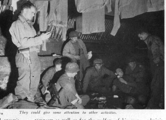 Now too was an opportunity to check clothing and equipment, and in supplying those necessities of life and of combat, Major Marton and the supply services of Service Company found little more time on their hands than before. They had set up a weapons repair shop in order to save the evacuation of a large number of weapons. There was the task of battlefield salvage, of coordinating the issue of rations - hot meals or K rations, or C, or 10-in-1 rations, depending upon the tactical situation. There was the problem of checking replacements and correcting shortages of equipment, and of handling the pass details and shower details. The job was done in a way to maintain the high morale of the men and the effectiveness of the Regiment.