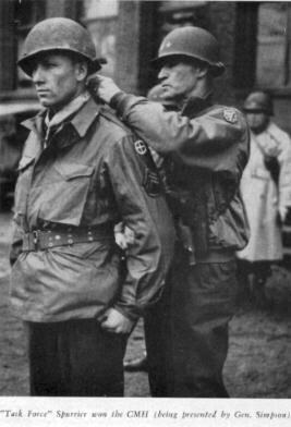 Abreast of Company F on the outskirts of Achain was Company G, and that company was finding the fighting as difficult as were the others. Again German defenders had established themselves in an orchard, and their intense and accurate small arms fire was a definite deterrence for men trying to reach the town. At this point Pfc. J. B. Isbell of Tennessee, already holder of the Silver Star, entered the picture. He entered the orchard alone, and immediately obtained such a fire superiority that three Germans were killed and he emerged with seven prisoners. Staff Sergeant Junior J. Spurrier of West Virginia, meanwhile, appeared to be growing impatient with the whole thing. Nominally assigned to the command of the squad, Spurrier agreed with Caesar that it was easier to do it himself than to keep track of a whole squad. Now the 2nd Battalion had been attacking from the south toward Achain, and Company G, on the right, was moving around to come into the town from the east. Spurrier, however, left to his own devices (he already had earned the appellation "Task Force Spurrier" for his action in the attacks east of Nancy), elected to confound the enemy with a simultaneous entry from the west. He descended upon an enemy outpost with overwhelming suddenness, and two of his adversaries fell before the fire from his Garand rifle while the other fled. Much to his satisfaction, he found the streets alive with Germans. Now he pressed into service other weapons, from his own collection, from wounded enemy, or fallen comrades. A Browning automatic rifle was his principal weapon for the attack against the first strong point; his effective fire killed three more Germans here. Then he completed that particular phase by picking up a bazooka and firing rockets into the house to set it on fire. This brought out a captain, who was the garrison commander, a lieutenant, and 14 enlisted men. By this time other men of Company G were fighting their way through the streets, and Spurrier marched his prisoners down to turn them over to the company, and then he returned to his own sector to resume his house-cleaning activities. Another burst from his automatic rifle brought down another pair of Germans, but then he found himself under fire from a group of Germans in another building and he was out of ammunition. Fortunately, the Germans themselves had provided for this shortage, for Spurriers eyes fell on a good German grenade in the street. He picked it up and threw it into the window of the house to kill four more Germans and eliminate that particular danger spot. By this time two-thirds of the town was in the hands of the 2nd Battalion, but darkness came and the strenuous fighting continued through most of the night. Defense was organized to hold the part already taken, and Sergeant Spurrier had charge of one of the outposts. Making the rounds of the positions, he heard Germans talking in a barn. He stole up and set fire to some hay and oil at one corner of the barn. The occupants came out with their hands up, and Sergeant Spurrier marched another group of prisoners back to the command post. When he returned to the outpost he saw a figure crawling toward a sentry; there was no answer to his challenge, and another accurate shot ended the career of another German. This brought the days total up to about 25, and, in addition, he had captured two officers and 18 enlisted men. All this meant the addition of a Congressional Medal of Honor to the plucky sergeants collection of decorations.