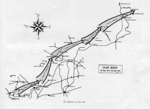 The turkey eaten, the 3rd Battalion marched out of armor-crowded Hellimer for St. Jean Rohrbach, about four miles up the highway to the northeast, to join Task Force Lagrew. The 1st Battalion, with Task Force Kroechel, moved from Erstroff to Petit Tenquin and prepared to attack toward Hilsprich.