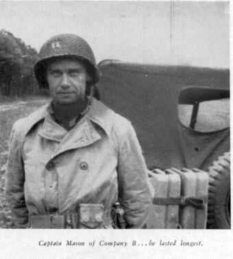 | Company E lost another commander when Captain Byron T. Blackburn of Nebraska, died in an artillery barrage near the Saar River. Barney Blackburn had joined the Regiment as an enlisted man, and had left Company Ms Mortar Platoon to take command of E Company in time to lead some of the attacks east of Nancy. He was sold on his new command. He was sure that his company was the best in the Regiment. "Theyll go anywhere," he had remarked once. "All I have to do is get out in front and say come on." |