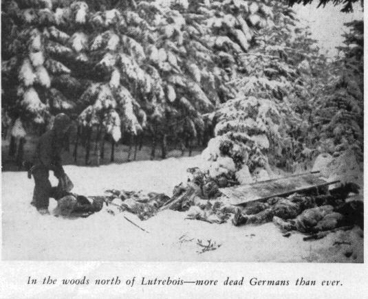 Companies I and K had regained complete possession of Lutrebois by 4 January, but beyond that they could not go. There was an attempt on the next afternoon, and parts of both companies got into the woods beyond Lutrebois, but there they found as much difficulty as had come to the L Company platoon a week earlier. In the confusion which developed when Germans were reported to be wearing American uniforms (probably overcoats, worn more for protection against the cold weather than for a trick), the companies fell back to Lutrebois and resigned themselves to its defense.