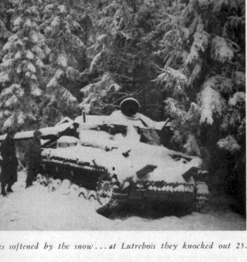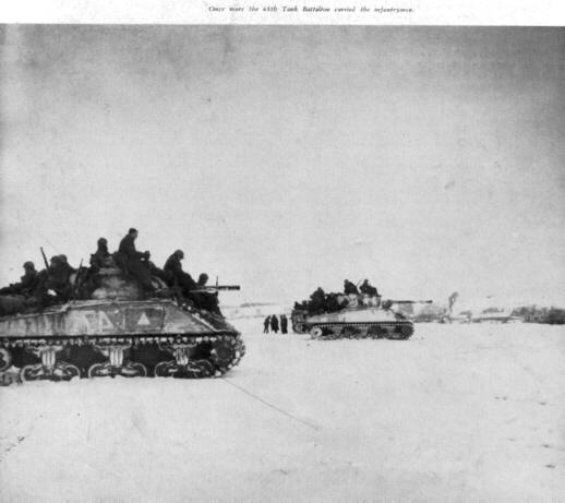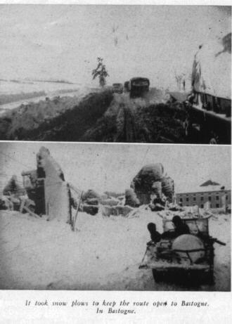 Initially the 2nd and 3rd Battalions (the 3rd on the right) assumed defensive positions in woods along the highway about a mile southeast of Bourcy, while the 1st Battalion reverted to Regimental Reserve and moved back to Oubourcy, Michamps, and Arloncourt. Remaining in this position while CCA and CCB renewed their drives to the northeast, the 2nd and 3rd Battalions advanced through the woods northeast of Bourcy on 21 January. Tanks and TDs moved along the open ground near the left edge of the woods, but the enemy had withdrawn. Biggest obstacle was the snow. Sometimes its depth was as much as three feet, and platoons found it necessary to rotate the exhausting position of trailbreaker. Greatest problem that evening, the objective achieved, was resupply across the deep snows - there was no road within a mile of the troops. Here the "weasels" - the track-laying cousins of the jeep - proved their indispensability. And further evidence of advantage of attachment to an armored division appeared, for light tanks carried loads of rations and water and equipment up to the companies - and towed jeeps which had tried but stalled in the snowdrifts.
