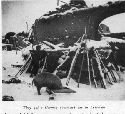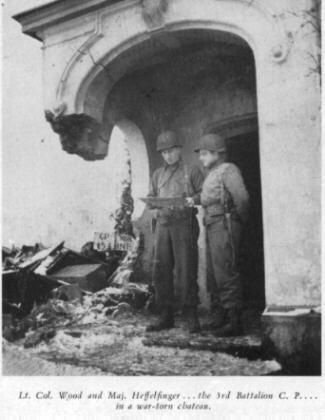 There was a strong hint that this might be more difficult that the initial action indicated when a platoon of Company L ventured into the woods beyond Lutrebois to seize the high ground. Then, when the whole platoon was into the woods to a depth of about 200 yards, automatic weapons began firing on all sides; even an 88mm gun began sending high velocity shells into the area. It was with considerable difficulty that the platoon was able to get back into the town, where it joined in setting up defenses. Company Ls headquarters group, mortar section, and a supporting platoon of heavy machine guns maintained a position in the woods overlooking Lutrebois in order to lend some depth to the position. Battalion Headquarters shared a shell-torn chateau - located in a natural hollow behind the wooded hill - with a headquarters of an armored infantry battalion whose troops were holding a line along the north edge of the woods.