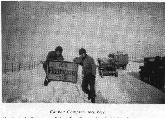 While the 3rd Battalion concerned itself with attack and defense around Lutrebois, the 1st Battalion, separated from the 3rd by 3,000 yards of snowfields and woods, was engaging Germans from the vicinity of Marvie. There the battalion consolidated its positions to present an effective barrier against further attempts at Bastogne. Able to maintain a penetrating sense of humor in any kind of situation, its commander, Lt. Col. Dan Craig, continued to add color to his military character as he applied an exacting efficiency to his tactical dispositions and to the task of bring up hot meals, when possible, and the supplies essential to combat in cold weather. (Typical Craigism: "A successful commander or staff officer must maintain a half-way belligerent attitude toward the next higher headquarters." "Optimism increases in direct proportion to the distance from the front lines." "Ones deeds in retrospect tend to magnify." And - after it was all over - "I would not take a million dollars for this experience; nor would I take a million dollars to repeat it.")
