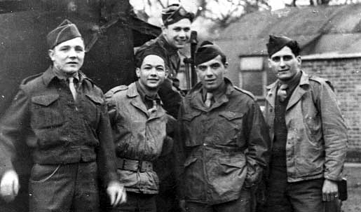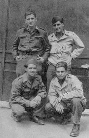 Left to right: Top Row standing - Joe Iello from Stanford, CT; Pfc. Peo Angelo Pantera from Detroit MI; Bottom Row (left to right) - Robert Parisi from Greenwich Village, NY; Thomas, last name unknown.
