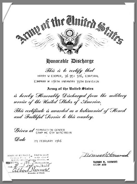 Harry W. Cooper was born on February 27, 1925. Prior to entering the U.S. Army he worked on his father's farm in Chandlerville, Illinois. He was inducted into the Army on March 2, 1944 at Ft. Sheridan, Illinois. He arrived in the ETO on August 25, 1944.
