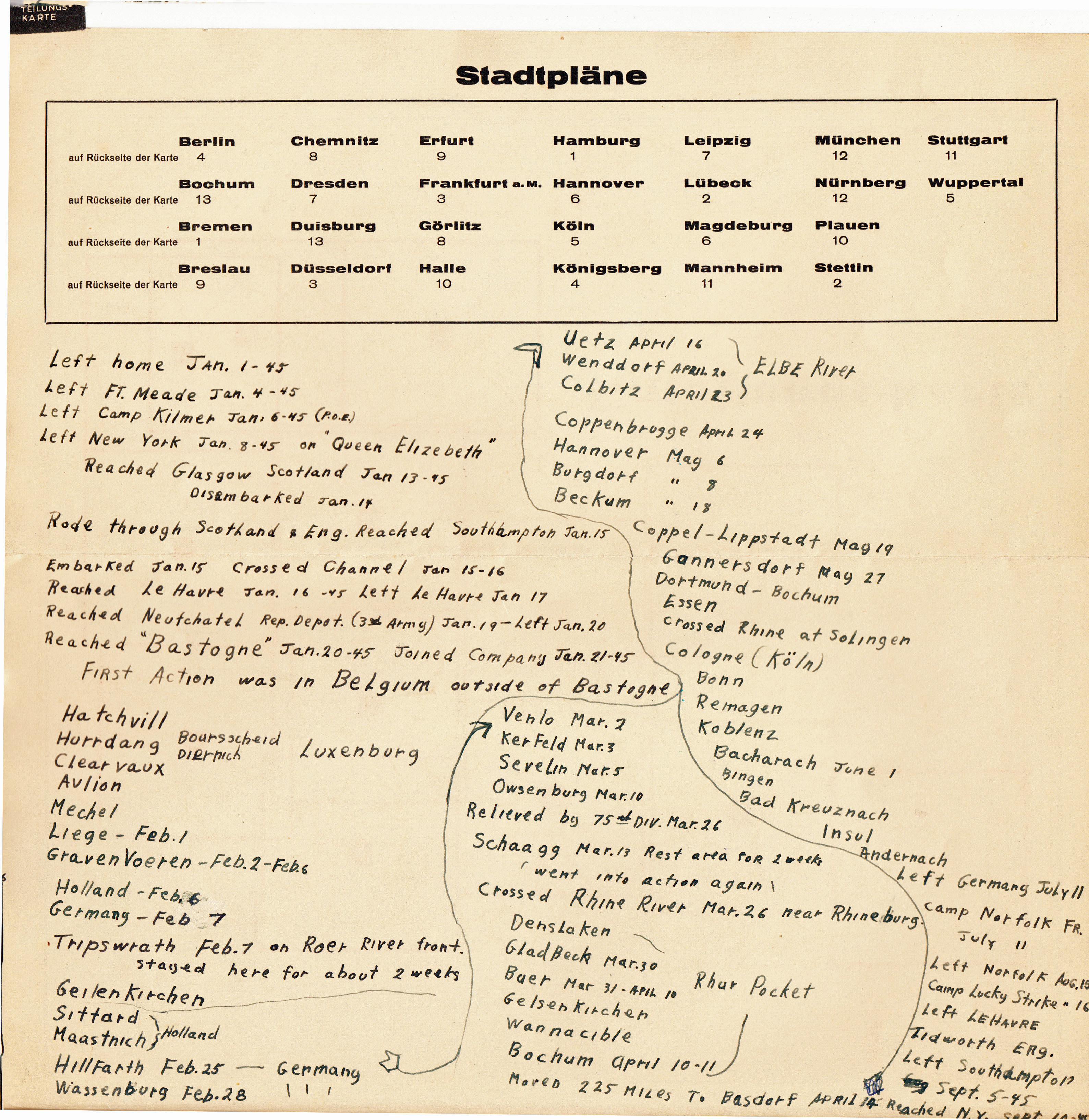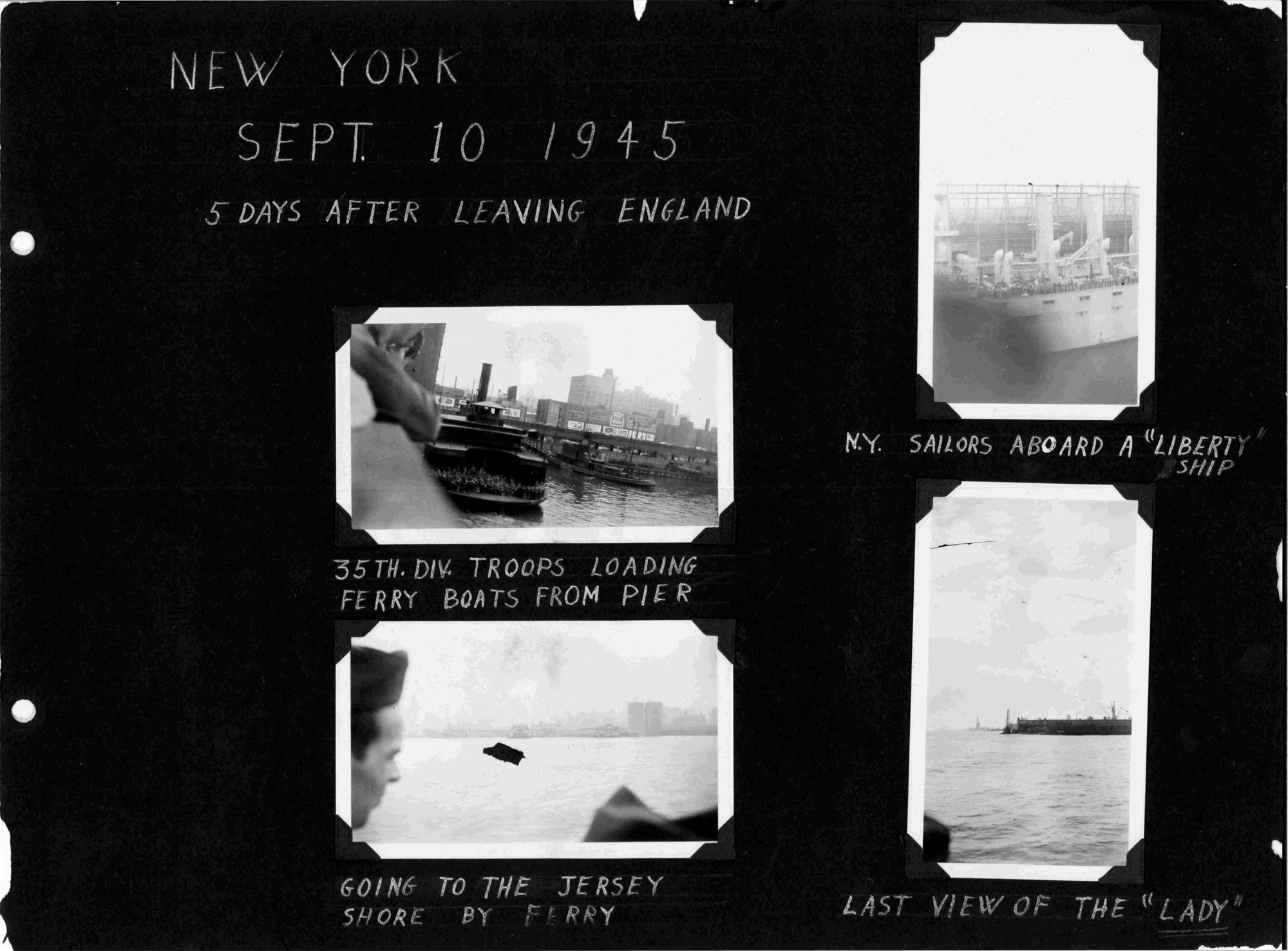He fought with the 134th Infantry for the remainder of the war, through Belgium, Luxembourg, Holland and Germany. He returned to the U. S. on the Queen Mary, departing South Hampton, England on September 5 and arriving in New York September 10, 1945. After returning to the States, he spent time at Camp Kilmer, NJ, Indiantown Gap, PA, and Camp Breckinridge, KY, where the 35th Infantry Division was deactivated in mid-November 1945.