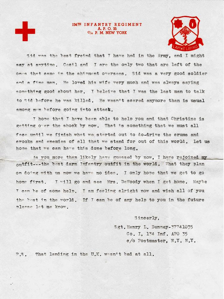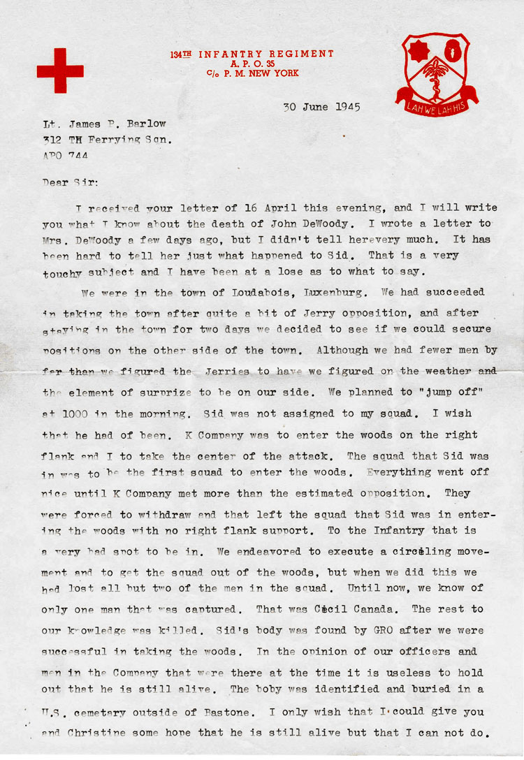 Pvt. John S. DeWoody served as a rifleman with Company I, 134th Infantry Regiment. He was killed in action by small arms fire on January 14, 1945. At the time he was killed, his Company was driving the Germans from strong positions which they had set up on the high ground and forest about 1 mile northeast of Lutrebois, Belgium. He is buried in the Luxembourg American Cemetery in Luxembourg City, Luxembourg. His grave location is Plot A, Row 7, Grave 7. He entered service from Prescott, Arkansas. He was awarded the Purple Heart Medal.