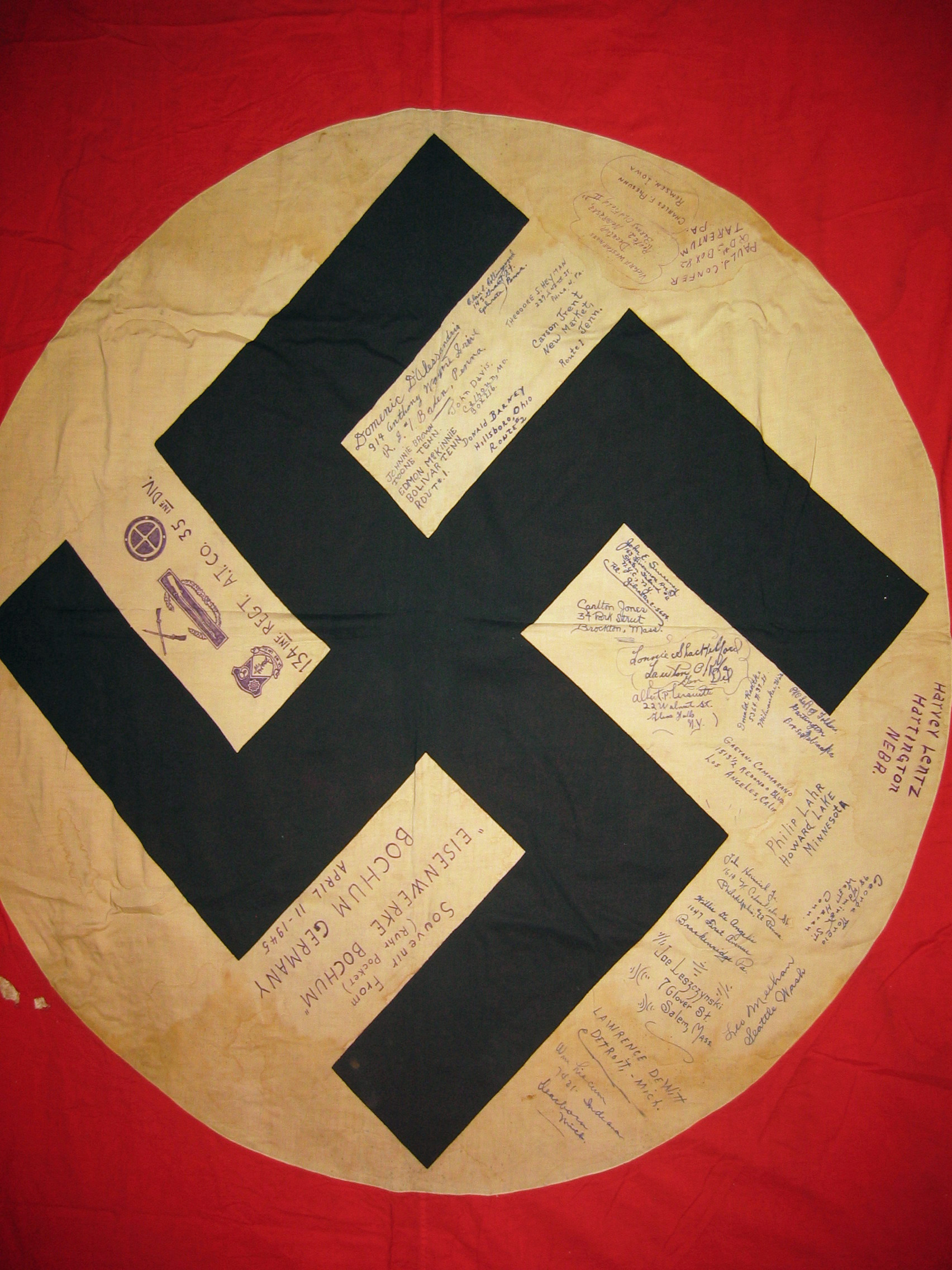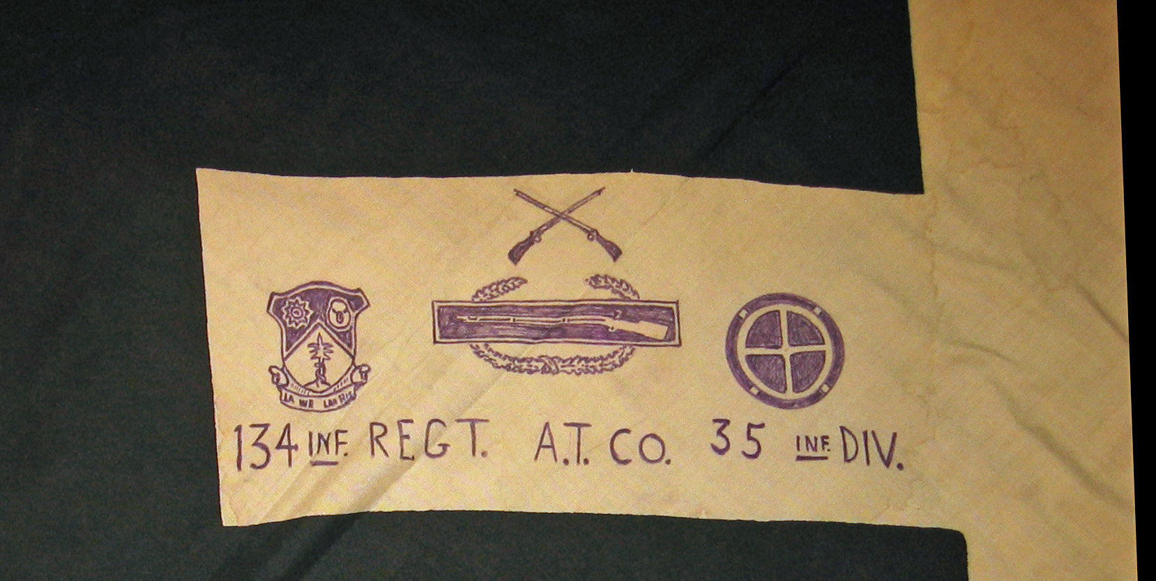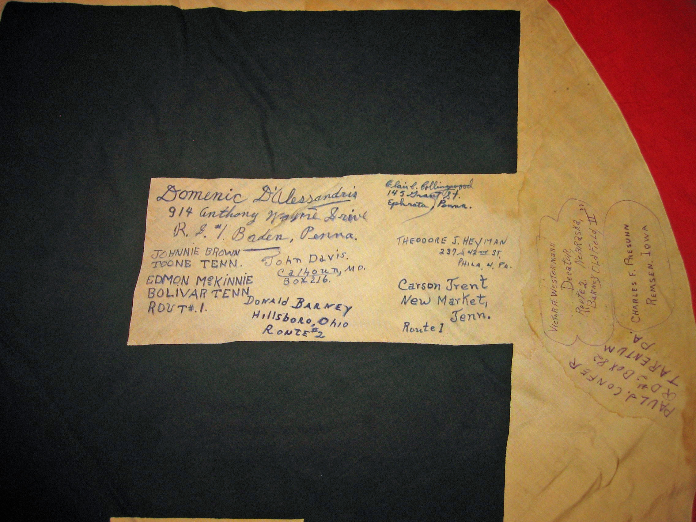The flag is signed by the following soldiers of Anti-Tank Company, 134th Infantry Regiment: