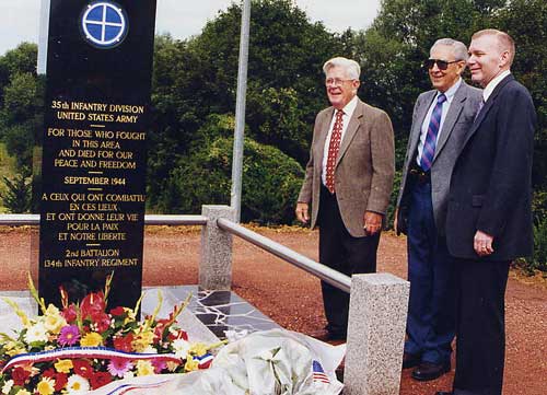 A handsome monument bearing the 35th Division insignia has been erected at Flavigny, south of Nancy, France in 1987. The monument is adjacent to the Goverment Bridge across the Moselle River. It recalls the "Night of Hell" of Sept. 10-11, 1944, when the Second Battalion of the 134th Regiment was decimated when it attempted to cross the river, preparatory to the drive on Nancy. Some 500 - 600 soldiers were killed, wounded, captured or lost. The 60th Engineering Battalion and the 110th Medical Battalion also suffered great losses in one of the bloodiest battles of the Lorraine Campaign. More than 400 French citizens subscribed to the campaign to erect the monument in . The inscription, in French and English, reads: "For Those Who Fought in This Area and Died For Our Peace And Freedom, September 1944. - This information was graciously provided by Paula Baker. |