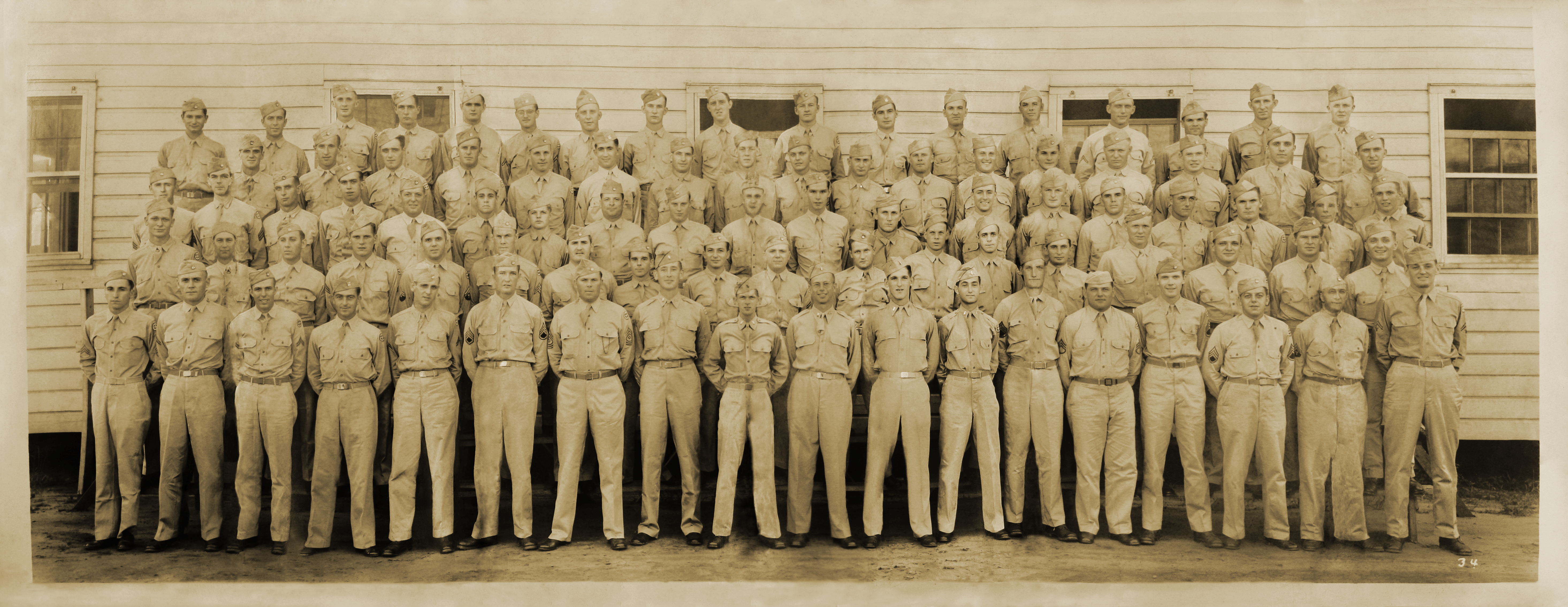 3rd Row - left to right: Sgt Stephens, Sgt Leonard V. Freeburg, Pvt Raymond J. Bade, Pvt Lloyd C Mabray, Pfc Erhardt L. Larson, Pfc Armin M. Birkner, Jr., Pfc Edward B. Arbogast, Pfc Arrigo, Pfc Harold M. Alderson, Pfc Lyle G. Cameron, Pvt Earl D Langworthy, Pfc Jacob Arnold, Pvt Frederick Rodriguez, Pvt Percy H. Henderson, Pfc Roy E. Pierce, Pvt L. Landers, Pfc Clyde Waltrip, Pvt Earl W. Ibach, Pfc Robert L. Bischoff