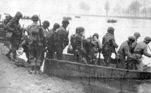 RIVER CROSSING TRAINING GIVEN TO MEN OF THE 1ST BN.,,134TH INF. REGT., 35TH INF. DIV., 9TH U.S.ARMY, ON THE MEUSE RIVER NEAR OBBICHT, HOLLAND. 202 COMBAT ENGINEER CORPSMEN ALSO TAKE PART IN TRAINING , AS THERE ARE THREE ENGINEERS WITH A SQUAD OF INFANTRYMEN IN EACH ASSAULT BOAT, TWO IN FRONT TO GUIDE IT AND ONE IN THE STERN WHO IS IN CHARGE OF BOAT [REGARDLESS OF OTHER RANKING MEN] AND STEERS IT WITH OAR. THESE MEN STAY WITH THE BOAT TO MAKE