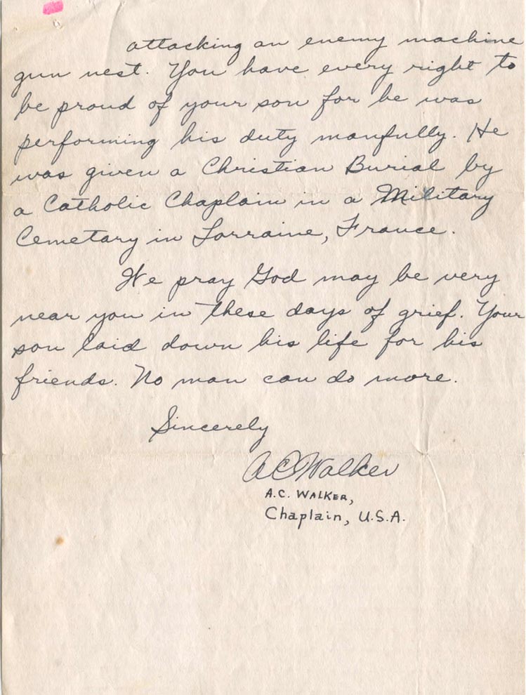 Chaplain A. C. Walker wrote the following letter to S/Sgt. Korejsza's mother, regarding the death of her son.