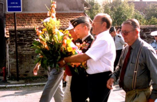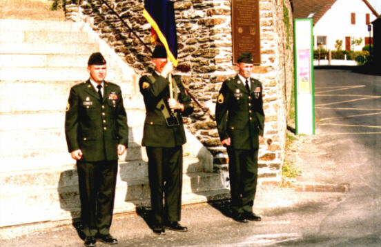 Ceremony in St. Georges Moncoq, France. Plaque (on right) was dedicated to the 134th Infantry Regiment, 35th Division in 1994.
