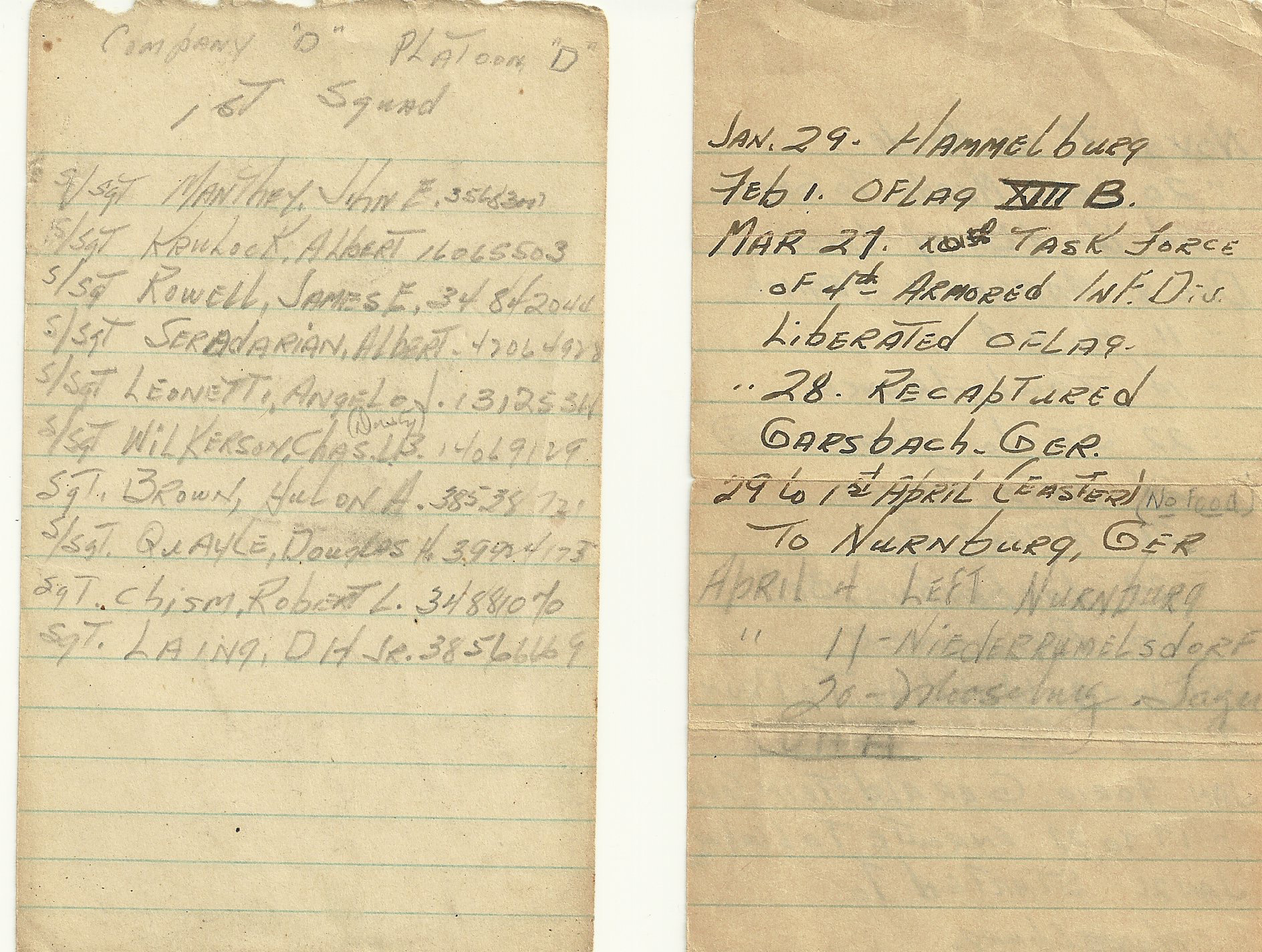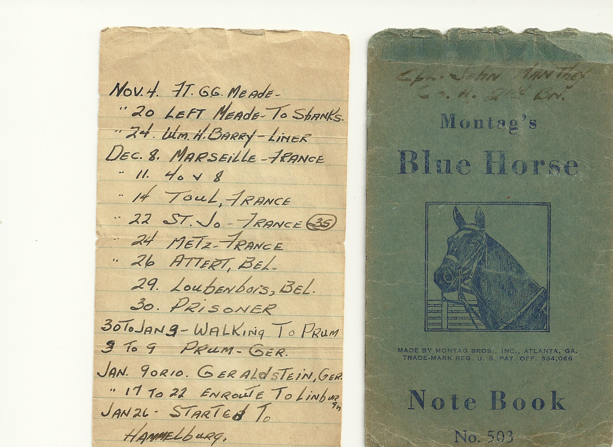 His handwritten journal reports his travels throughout his ordeal.: Third Army: 134th infantry Companies O and L.
