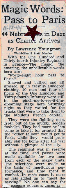 There is strong reason to believe Clem was granted leave to Paris following his promotion. In a scrap book kept by his mother, red stars were glued on every newspaper article that mentioned Clem's name. Although his name was not listed in an article about a group of officers being granted leave to Paris, she placed a red star upon this article. Clem's family also has photos of fellow soldiers of the 134th and other units in Paris as well as a photo that appears to show Clem in Paris. The article is dated November, 1944 which is shortly after the St. Lo Battle, his promotion and his Bronze Star citation. The article does not list all of the names who were granted leave so Clem may be among those not listed.
