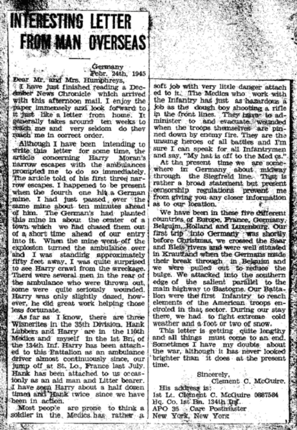 Clem was with 1st Battalion and the 134th throughout all of their movements in Europe and during all of their battles in France and Germany, including the Battle of St. Lo, the liberation of Nancy, the Gremecy Defensive, across the Lorraine and into Germany. It was around the time of the Gremecy Defensive that Clem sent a letter to his home town newspaper, the Wisner News Chronicle which published his letter about his time and that of a fellow solider from Wisner assigned to the 1st Battalion: