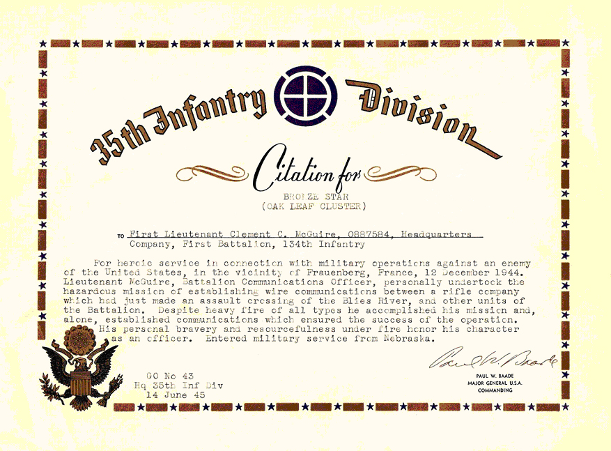 1st Lt. Clement C. McGuire, while serving with the Army of the US, distinguished himself by heroic service in connection with military operations not involving participation in aerial flight against an enemy of the US. On 12 December 1944, in the vicinity of Frauenberg, France, 1st Battalion, 134th Infantry, was engaged in action against the enemy. One Rifle Company had crossed the Blies River into Germany and in so doing had been badly depleted by casualties. The Battalion Commanding Officer ordered wire communications be established between the rifle company across the river and the rest of the Battalion. Lt. McGuire, Battalion Communications Officer, 1st Battalion, 134th Infantry, realizing the extremely hazardous mission, chose to go himself rather than send his wireman. Lt. McGuire successfully strung wire to the rifle company under the constant heavy artillery, mortar and small arms fire in the area, doing so by crossing a foot bridge which had been hit by artillery fire and was definitely a precarious crossing, pronounced unsafe by the engineers. His heroic action was instrumental in the success of the river crossing and is in accordance with high military tradition. |