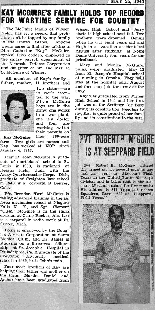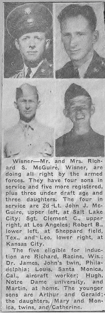 Clement Cyrillus McGuire was born August 1, 1912. He was the third oldest child in a remarkably large family of 16 children. His parents were Richard S. McGuire and Mary E. McGill both of whom grew up near the small farming community of Wisner, Nebraska. Both Richard and Mary lived within a large Irish Catholic community residing in the area. Richard chose the occupation of farmer and by the time they were married on January 7, 1909, Richard owned a farm north of Wisner which would later be referred to as the "old home place". He would later acquire additional farms. |