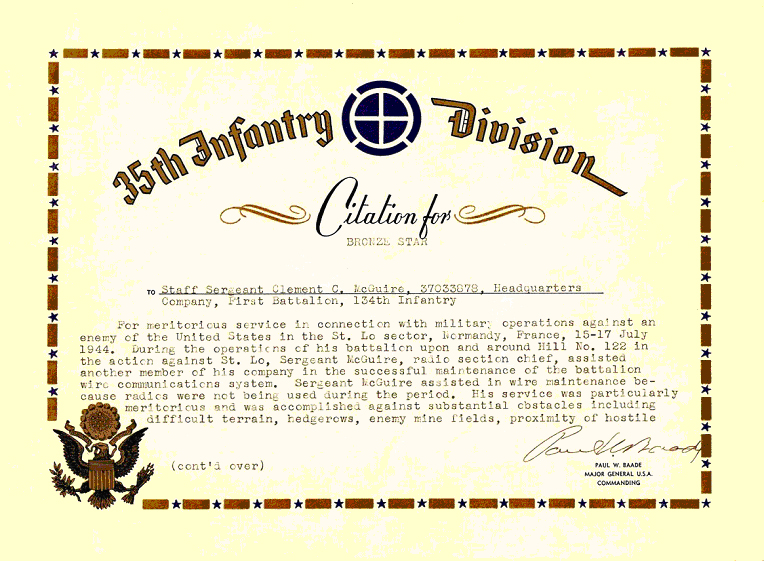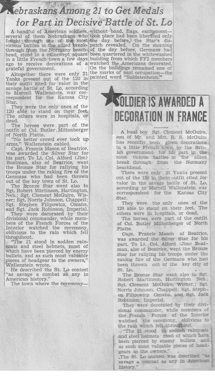 During the Battle of St. Lo, Clem was awarded the Bronze Star. Various Nebraska newspapers, including the Omaha World Herald ran articles on the subject of the award ceremony that was held for Clem and other soldiers from Nebraska who received commendations during this battle.