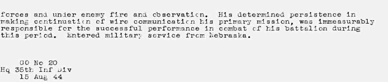 This occupation would later help to shape his role for the infantry as he was assigned to HQ as a communications officer in the 35th Infantry (134th Infantry Division, 1st Battalion). This assignment began his active military service.
