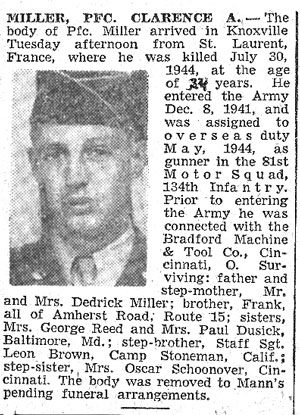 Clarence Areni Miller, son of Dedrick Day and Bessie Marie (Daniel) Miller, was born March 9, 1920 in Oliver Springs, Tennessee. He registered for the draft on July 3, 1941. His draft record lists him as 5’ 7” tall, weighing 130 pounds, with brown hair, brown eyes and a ruddy complexion. He was inducted into the Army December 14, 1941 at Fort Thomas, Kentucky. He served as a Light Mortar Crewman in the Mortar Platoon, Company M, 134th Infantry Regiment. Pfc Clarence A Miller was Killed in Action south of St Lo, France in the vicinity of Torigini Sur Vire on July 30, 1944. He is buried at Solway Cemetery, Solway, Tennessee.