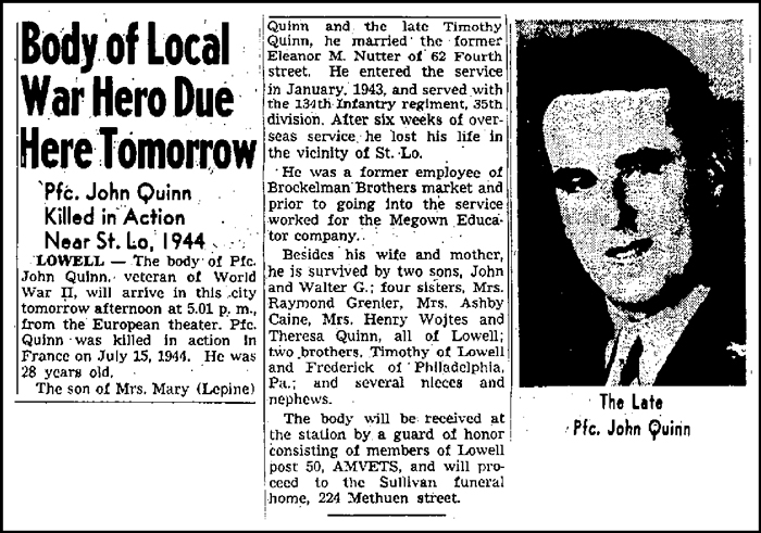 John Quinn, son of Timothy and Mary (Lepine) Quinn, was born May 14, 1916 in Lowell, Massachusetts. He married Eleanor Mae Nutter on August 2, 1941. He was inducted into the Army on January 20, 1943 at Fort Devens Massachusetts. Pfc John Quinn served as a Rifleman in Second Platoon, Company L, 134th Infantry Regiment. He was Killed in Action July 15, 1944 during the battle for St Lo, France. He is buried at Saint Patrick Cemetery, Lowell, Massachusetts.
