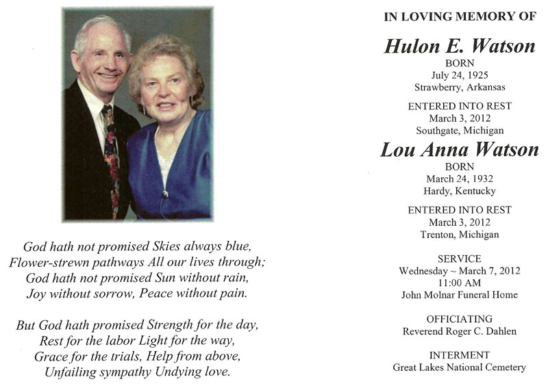 Hulon Watson served with the 134th Infantry Regiment, Company G. He and his wife Lou Anna lived in Southgate, Michigan. He passed away on March 3, 2012. His wife, Lou Anna, passed away the same day, 12 hours later.