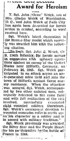 Weick Gets Second Award for Heroism Tech. Sgt. John "Gene" Weick, son of Mrs. Gladys Weick Washington, D.C., and John Weick of Falls City has again been decorated for heroic action in combat, according to word received here. Sgt. Weick's latest decoration is the Bronze Star medal which recently was awarded him with the following citation. "To Tech. Sgt. John E. Weick, Co B, 134th infantry, for heroic service in connection with military operations against an enemy of the United States near Hilforth, Germany, on February 26th, 1945. Sgt. Weick participated in an attack across an anti-personnel mine field and into the town of Hilforth against fierce enemy resistance. When the objective was secured, Sgt. Weick, accompanied by two other enlisted men, voluntary returned to the minefield and with realization of risk involved, successfully evacuated eight wounded soldiers there from. Sgt. Weick's courageous devotion to wounded comrades reflect credit upon his character as a soldier and is in accord with military tradition." Sgt. Weick previously was awarded the Silver Star and Purple Heart for his participation in the battle of France in 1944. |
